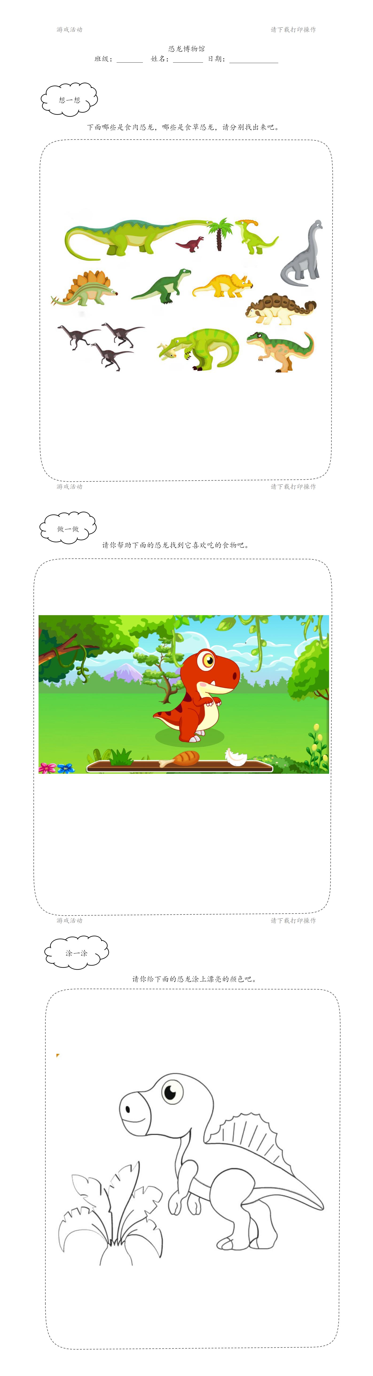 活动延伸:鼓励幼儿多去观看有关恐龙的视频或者和家人一起去参观恐龙博物馆。