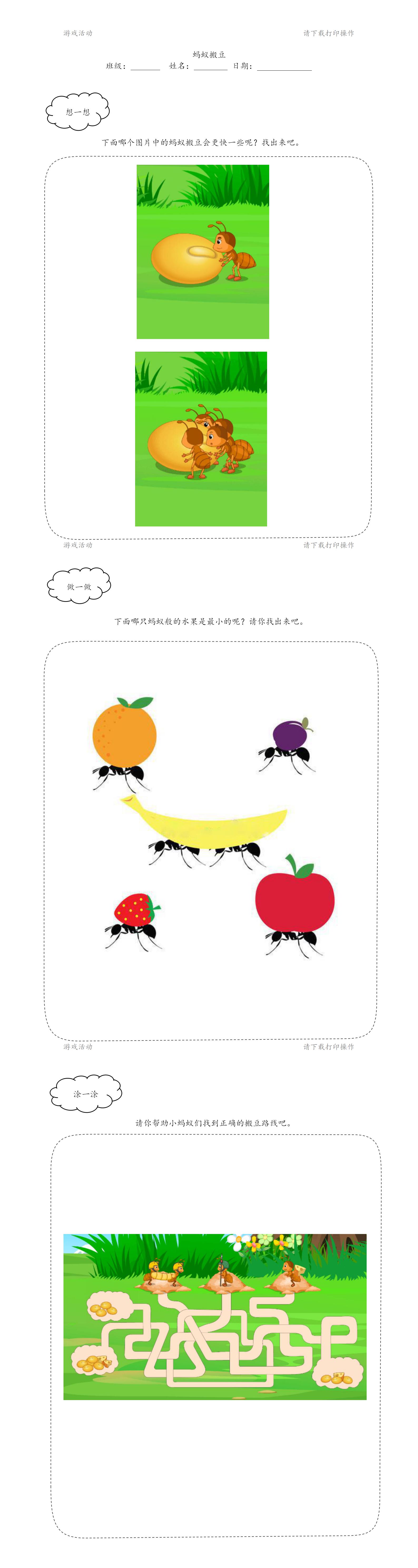 活动重点: 了解蚂蚁的分工,知道它们是怎么搬运食物的,懂得团结就是力量。
