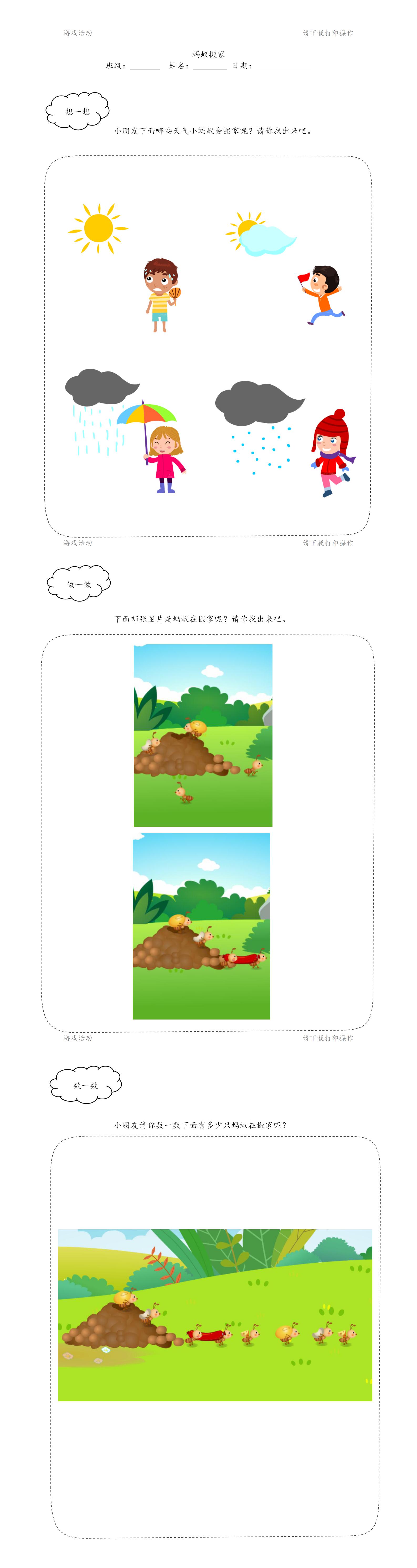 活动重点: 让幼儿意识到小蚂蚁搬家是为了躲避雨水淹没它们的家。