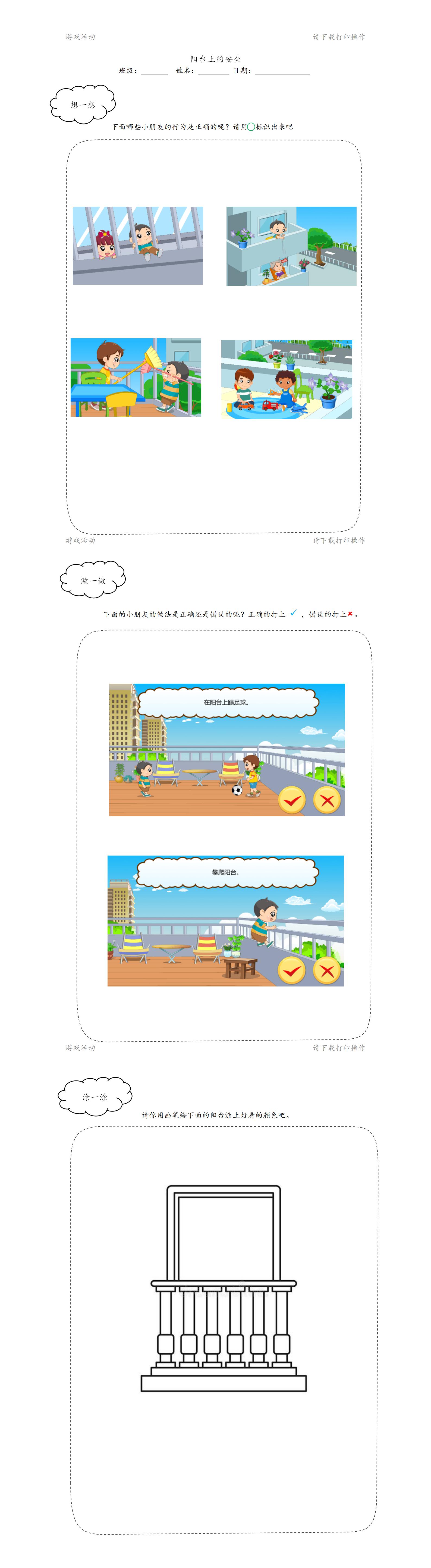 活动延伸:建议家长在家中经常提醒幼儿在阳台上注意安全,及时阻止危险行为,增强安全意识。