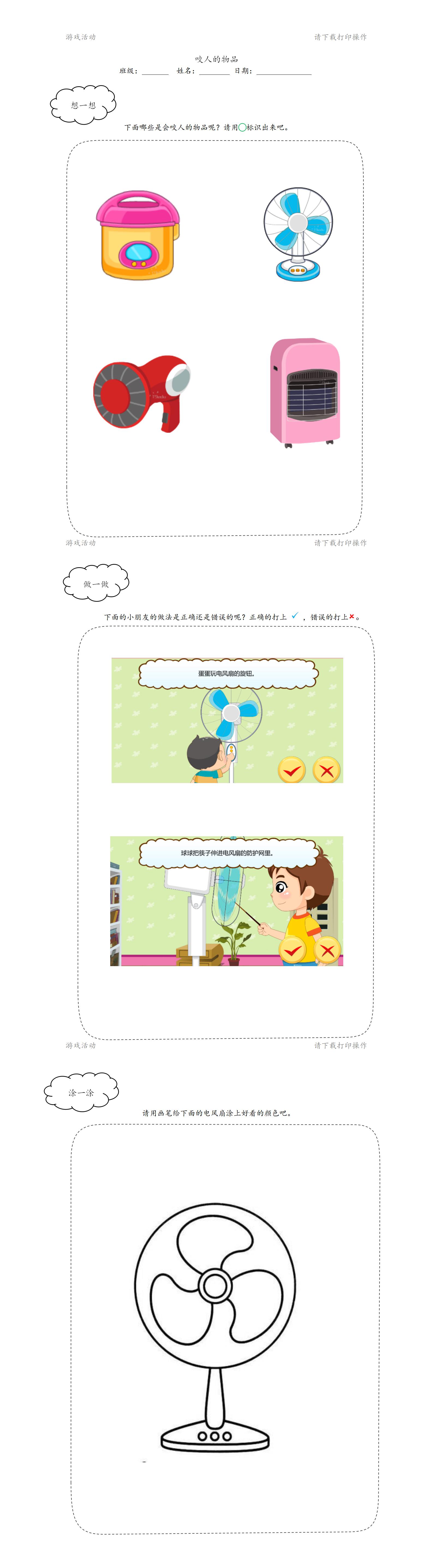 小结:电风扇电源口有点,小朋友不要自己去插电源,还有转动的风扇去触碰也是很危险的。