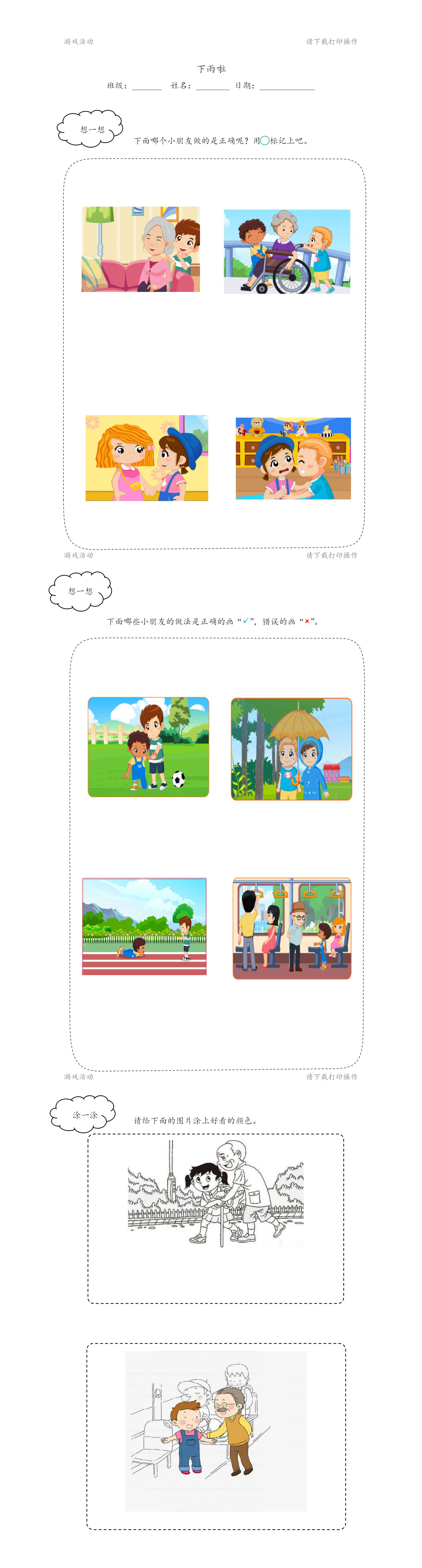二、说一说:我们在生活中,也要像小鸡和小鸭学习,当别人遇到困难时,要帮助别人,助人为乐。如果你遇到图中的场景,你应该怎么做呢?