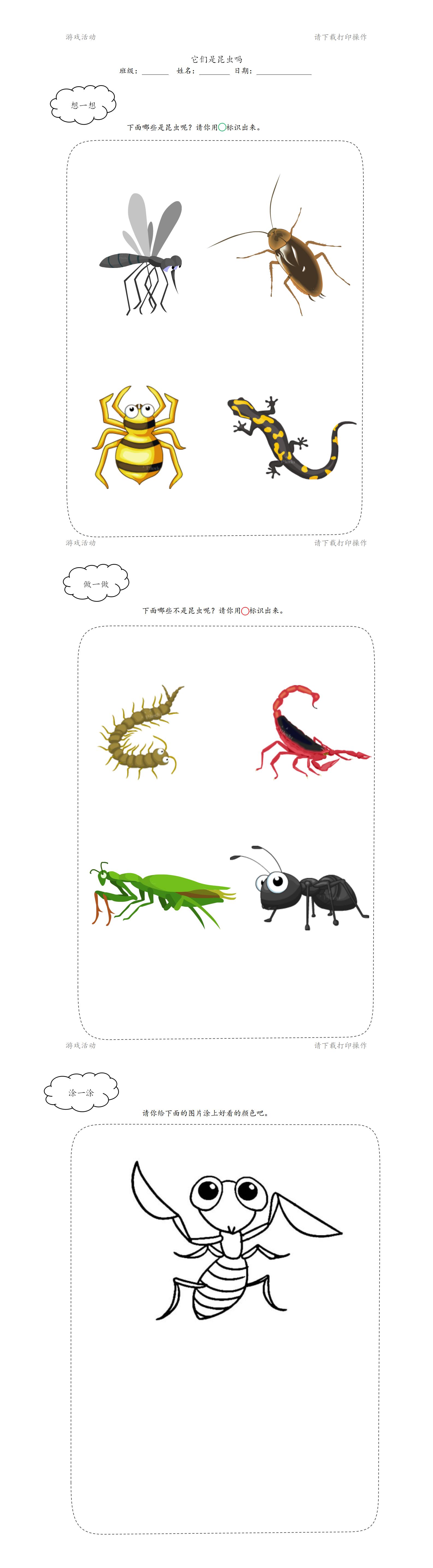 物质准备:动画片《它们是昆虫吗》、想一想、考一考、游戏互动
