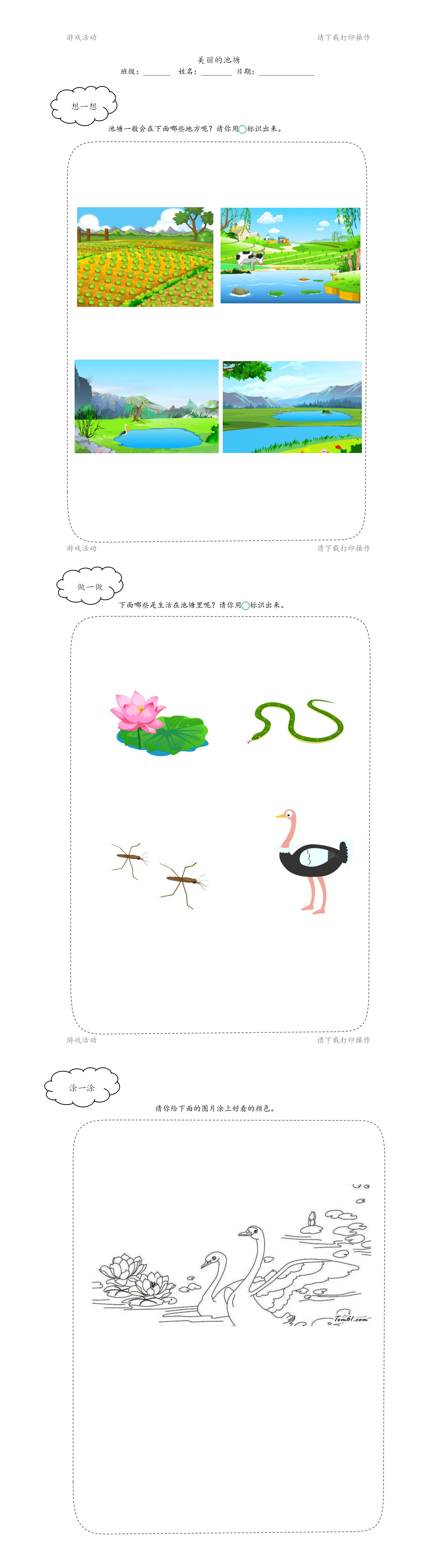 活动延伸:把池塘的电子挂图贴在在活动区域,让幼儿观察加深印象。