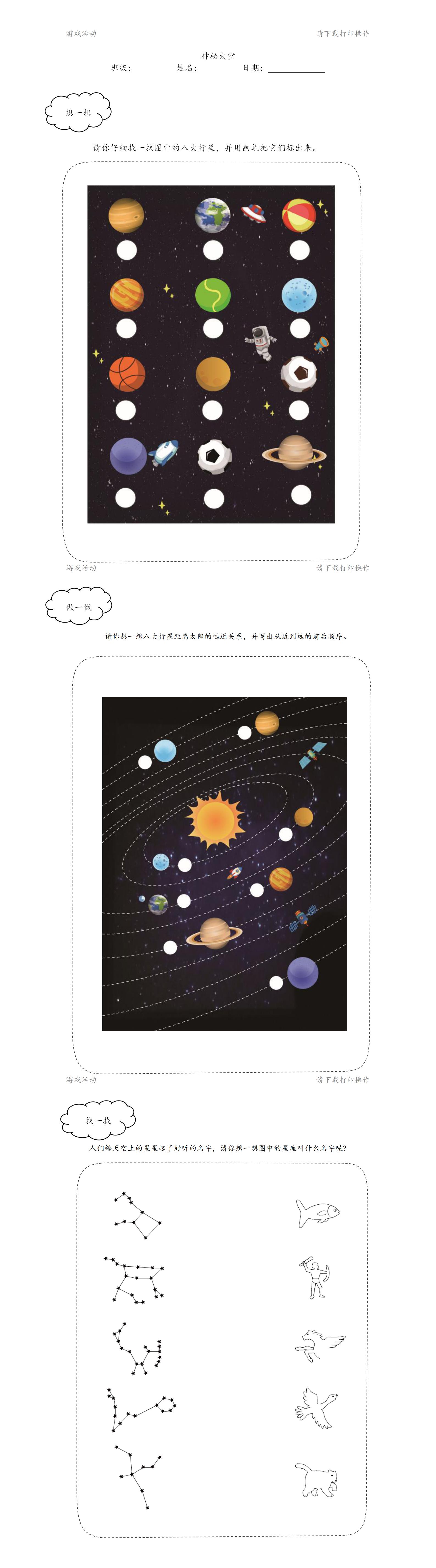 活动重点:认识太阳系的八大行星名称,学习八大行星的排列位置。
